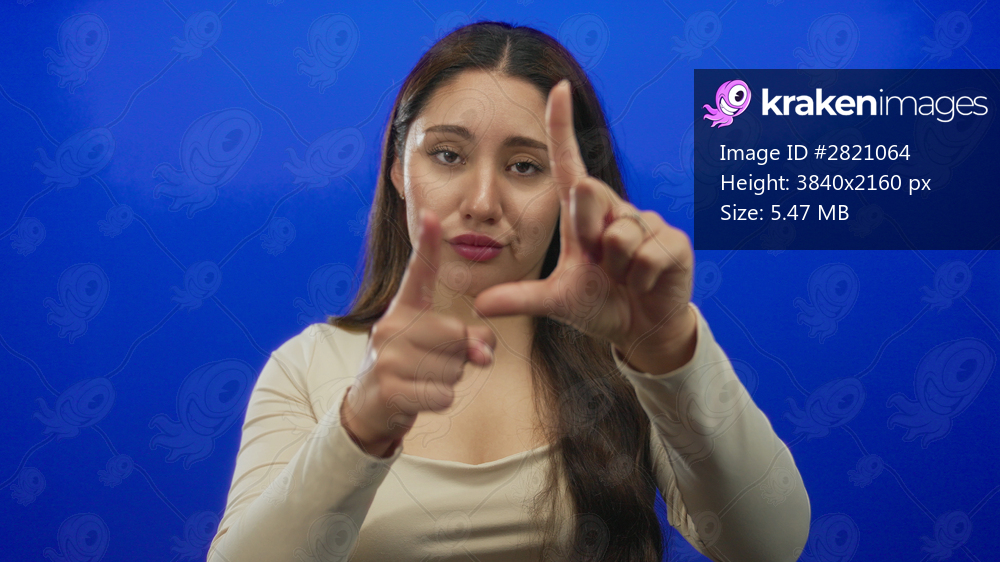Woman making a loser sign gesture with her hand framing her face in a blue studio setting with neutral expression; mockery.