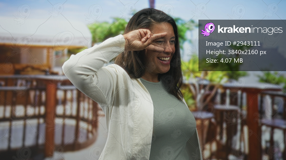 Woman making a peace sign with fingers by her eye while smiling, hand visible and wearing a ribbed top in a studio backdrop; playful confidence.
