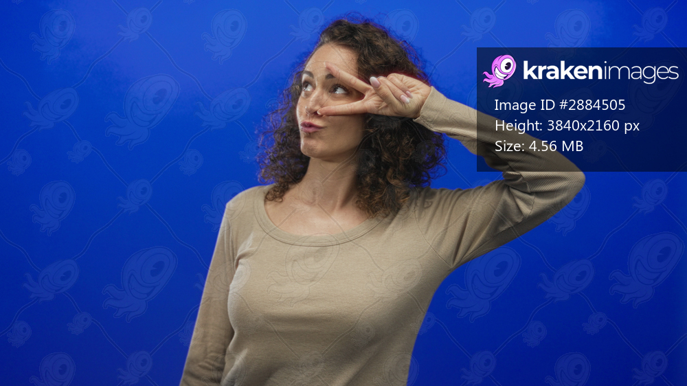 Woman making a peace sign with hand near face in bright blue studio; playful confidence optimism warmth.