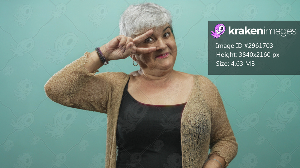 Woman making a peace sign over her eye with her hand, smiling against a teal studio backdrop; joy confidence.