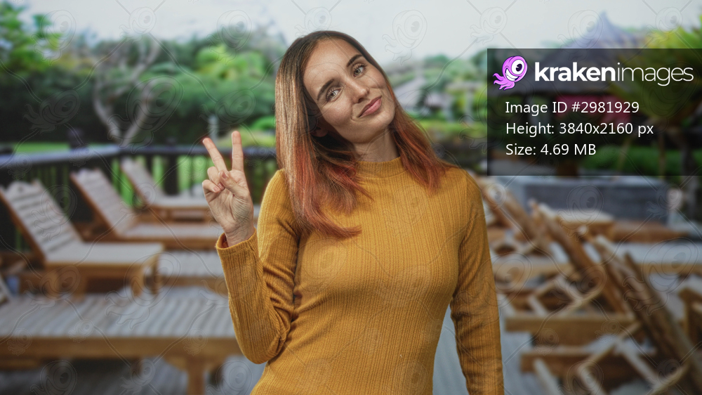 Woman making a peace sign with right hand by wooden deckchairs on a resort deck near a pavilion building, wearing a mustard sweater and smiling; playful leisure. - Kraken Images