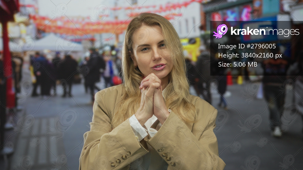 Woman making a pleading gesture on a busy city street, surrounded by vibrant urban life and blurred pedestrians.