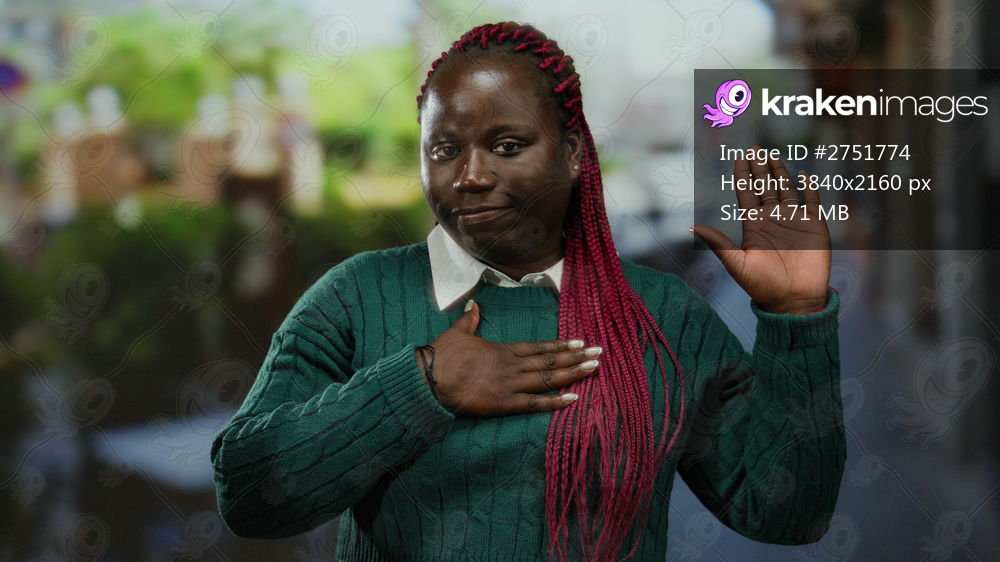 Woman making a pledge on a city terrace, wearing a green sweater, with braided hair, showing sincerity and commitment in a vibrant urban outdoor restaurant setting. - Kraken Images