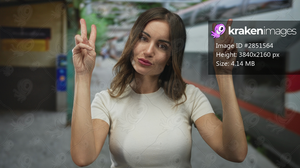Woman making air quotes with both hands at a train station platform, eyes rolled upward and lips pursed in an exasperated expression; sarcasm doubt.