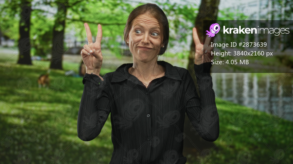 Woman making air quotes with both hands by a pond in a forest park with green trees and grass, expressive face and fingers visible; sarcasm.
