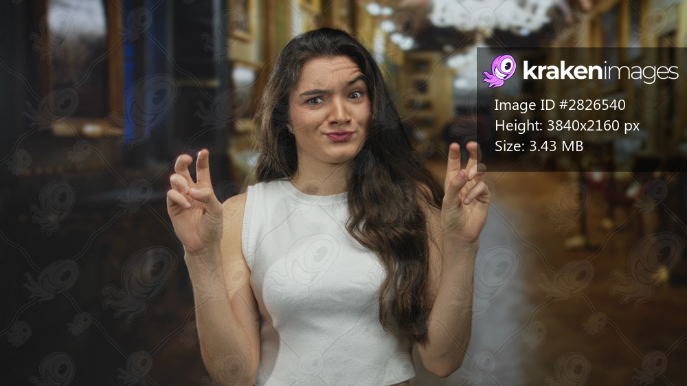 Woman making air quotes gesture with fingers in grand museum building hall lined with paintings; sarcasm irony skepticism mockery.