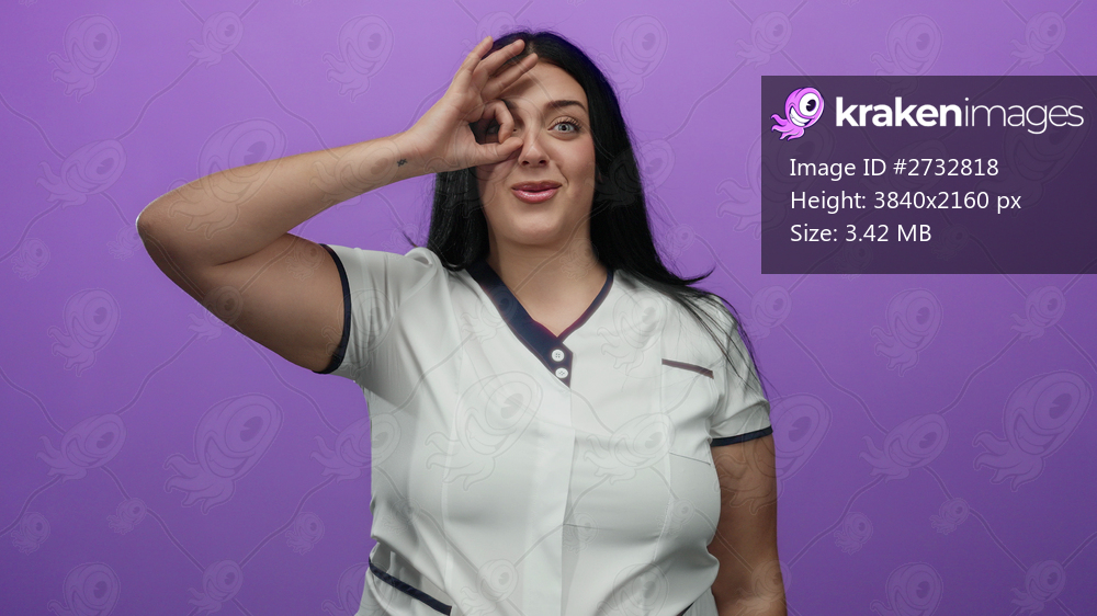 Woman making an ok gesture near her eye, smiling confidently against a vibrant purple background, highlighting her plus size and curvy figure with a sense of positive body image. - Kraken Images