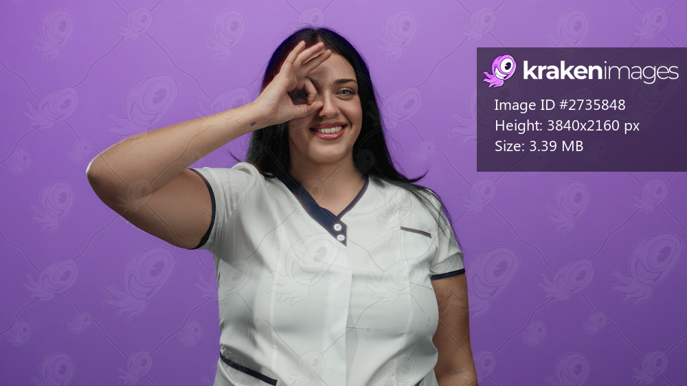 Woman making an ok gesture near her eye, smiling confidently against a vibrant purple background, highlighting her plus size and curvy figure with a sense of positive body image. - Kraken Images