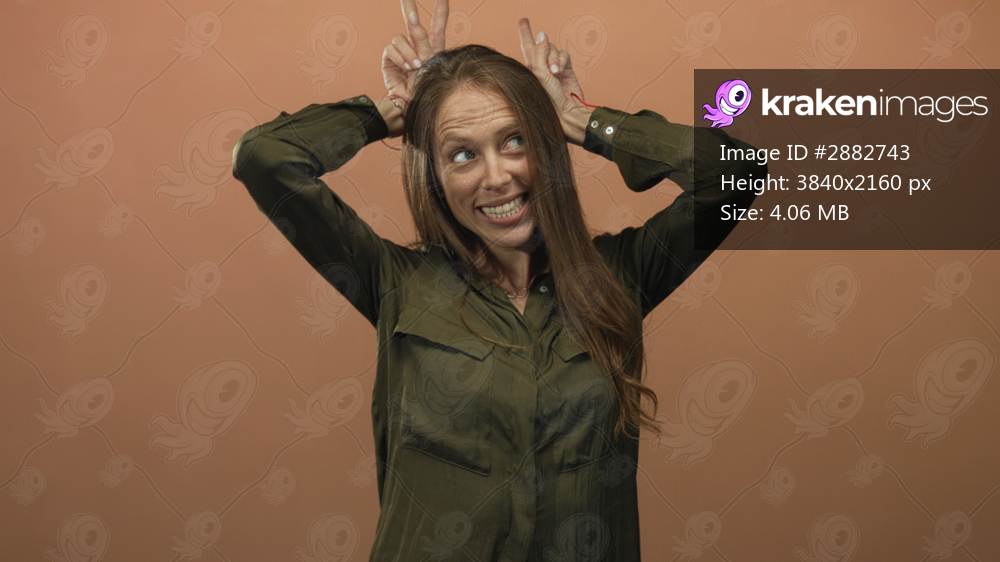 Woman making bunny ears with fingers and smiling in studio with peach backdrop wearing olive shirt; playful joy fun.