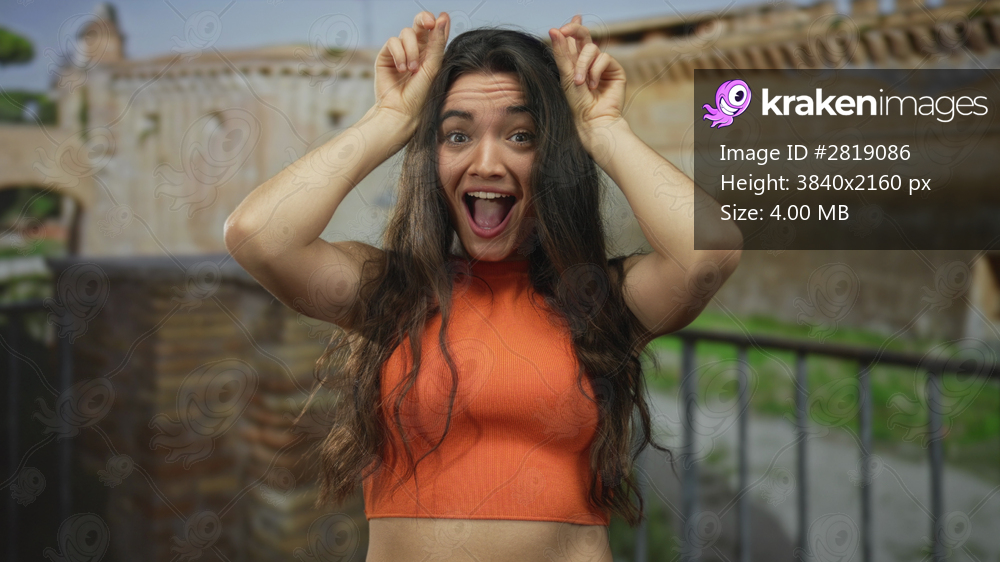 Woman making bunny ears gesture at a roman building while smiling against weathered stone walls; playfulness.