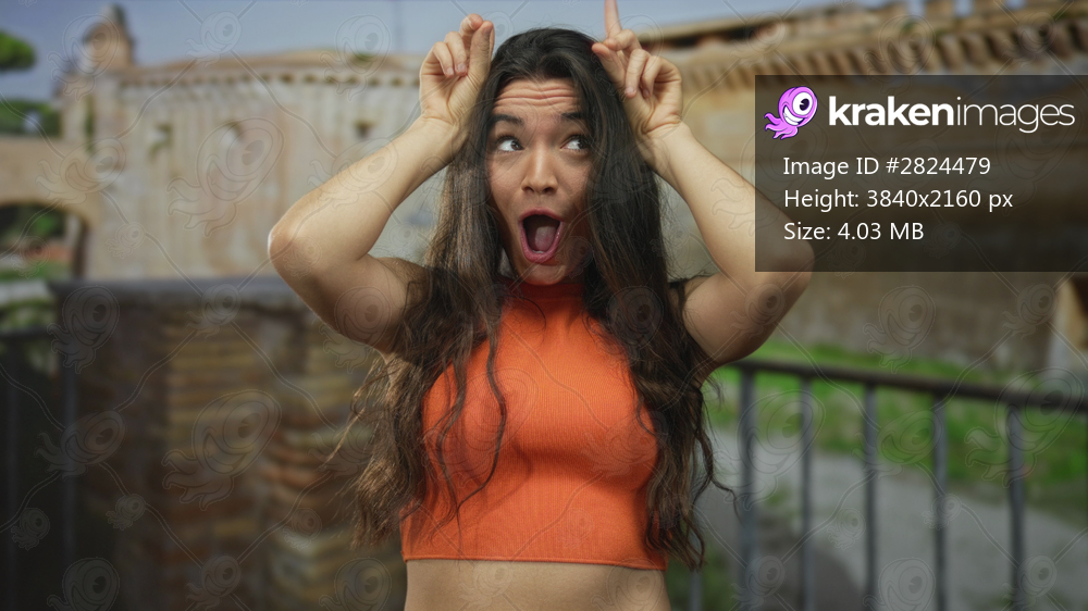 Woman making bunny ears gesture at a roman building while smiling against weathered stone walls; playfulness.