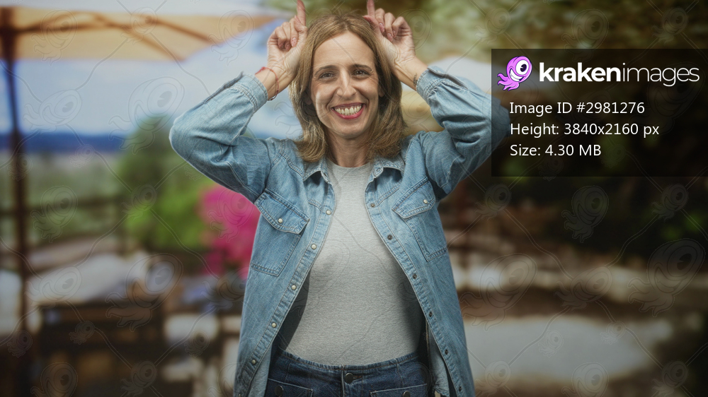 Woman making bunny ears with hands and smiling on a patio cafe terrace by tables and umbrellas, wearing denim jacket and gray shirt; playful joy.