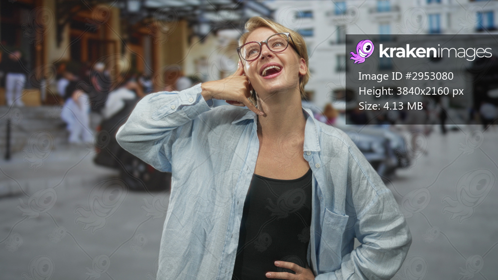 Woman making call gesture with hand to ear, wearing glasses and light blue overshirt on a busy street with cars and building facades; playful confidence. - Kraken Images