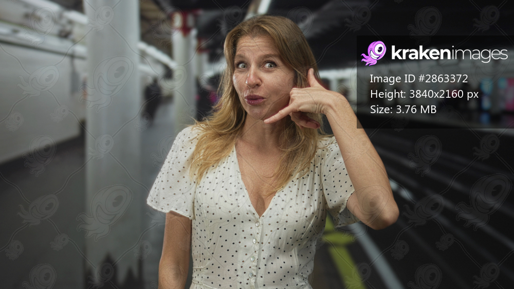Woman making call hand to ear gesture while pointing with other hand on station platform; playful invitation.