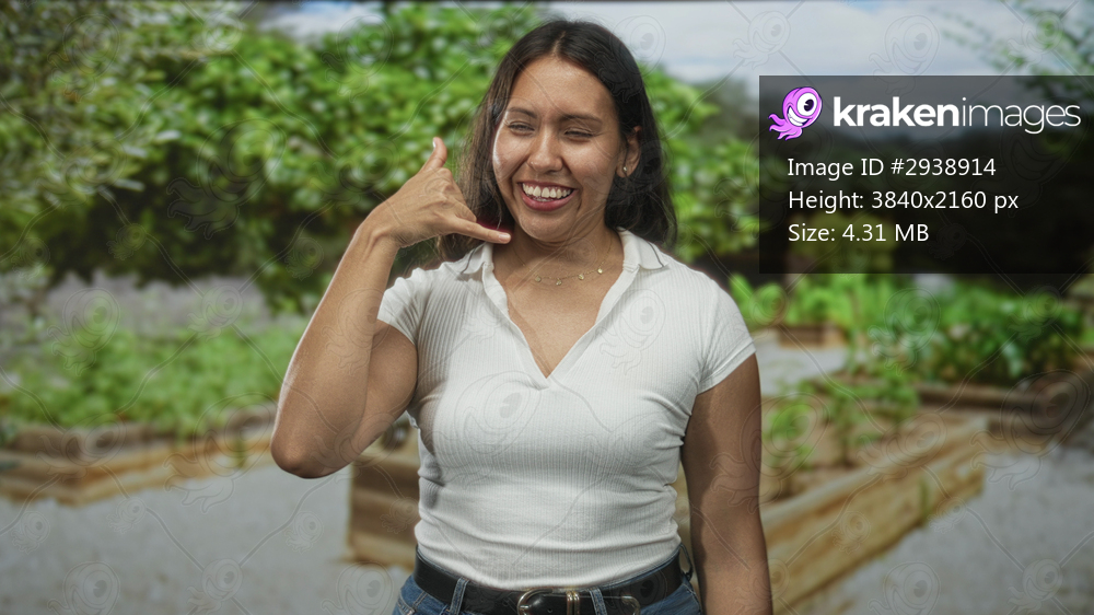 Woman making call me hand gesture with hand near ear on street with garden planters, wearing white shirt and jeans; friendly invitation.