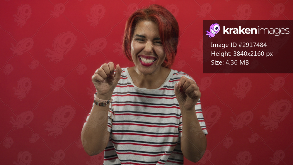 Woman making claw hands and squinting grin, showing teeth and raised wrists while wearing a striped tee in a red studio; playfulness expression.