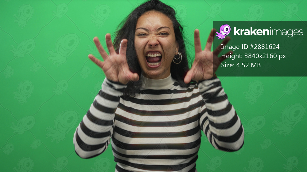 Woman making clawing gesture with hands and snarling expression in studio with bright green backdrop; playful mischief.