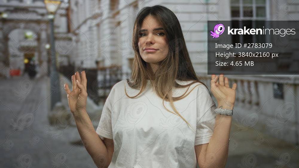 Woman making dismissive gesture on city street with architectural background featuring young hispanic outdoors urban scene casual white shirt brunette hair - Kraken Images