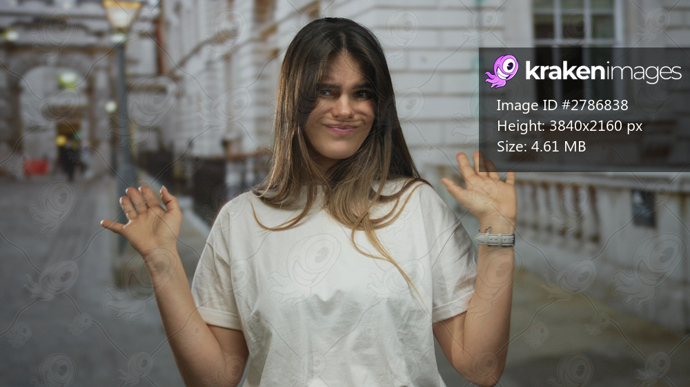 Woman making dismissive gesture on city street with architectural background featuring young hispanic outdoors urban scene casual white shirt brunette hair - Kraken Images