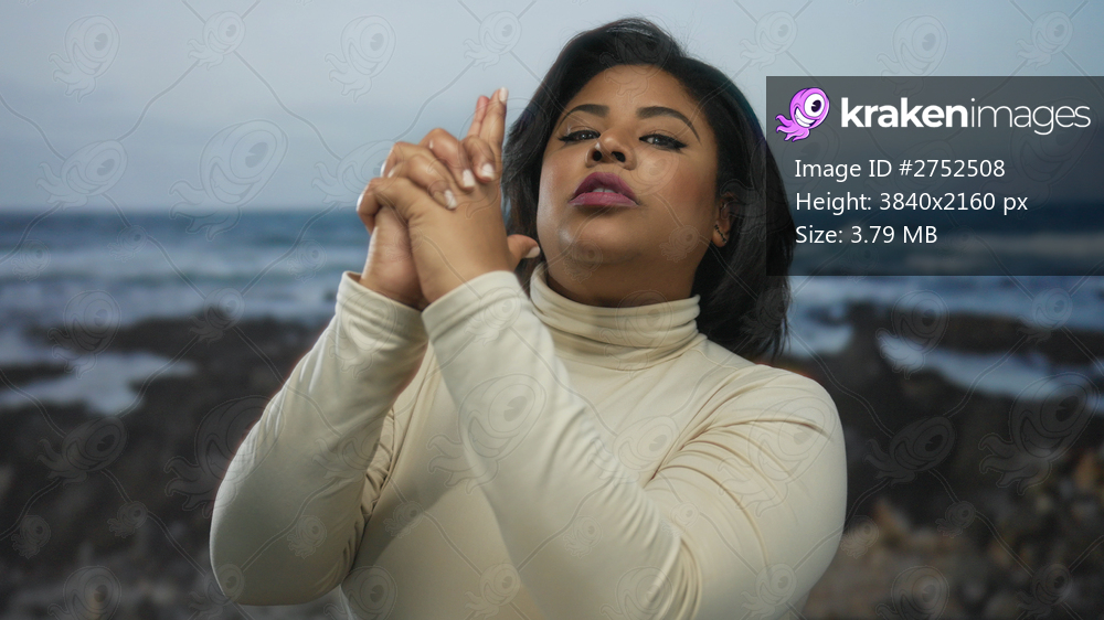 Woman making finger gun gesture on beach with ocean backdrop, capturing playful moment with confident expression, emphasizing beauty and nature in frame. - Kraken Images
