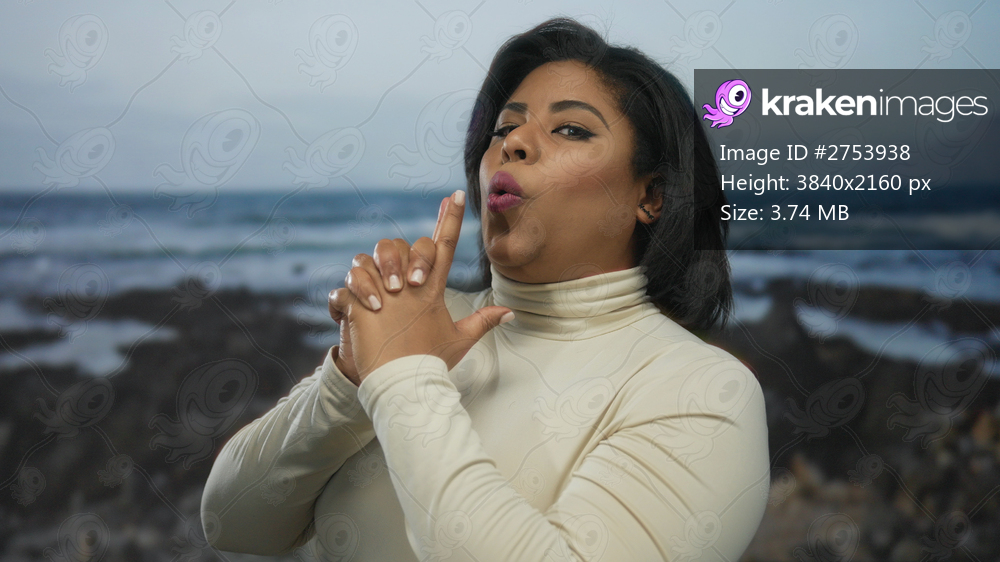 Woman making finger gun gesture on beach with ocean backdrop, capturing playful moment with confident expression, emphasizing beauty and nature in frame. - Kraken Images
