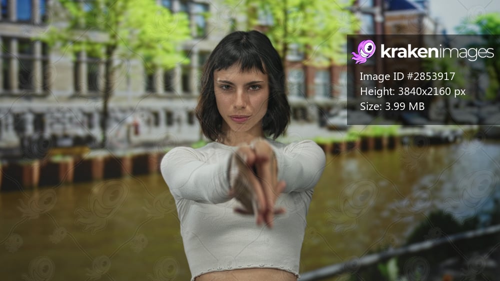 Woman making finger gun gesture on street along canal in amsterdam; playful confidence and bold energy.