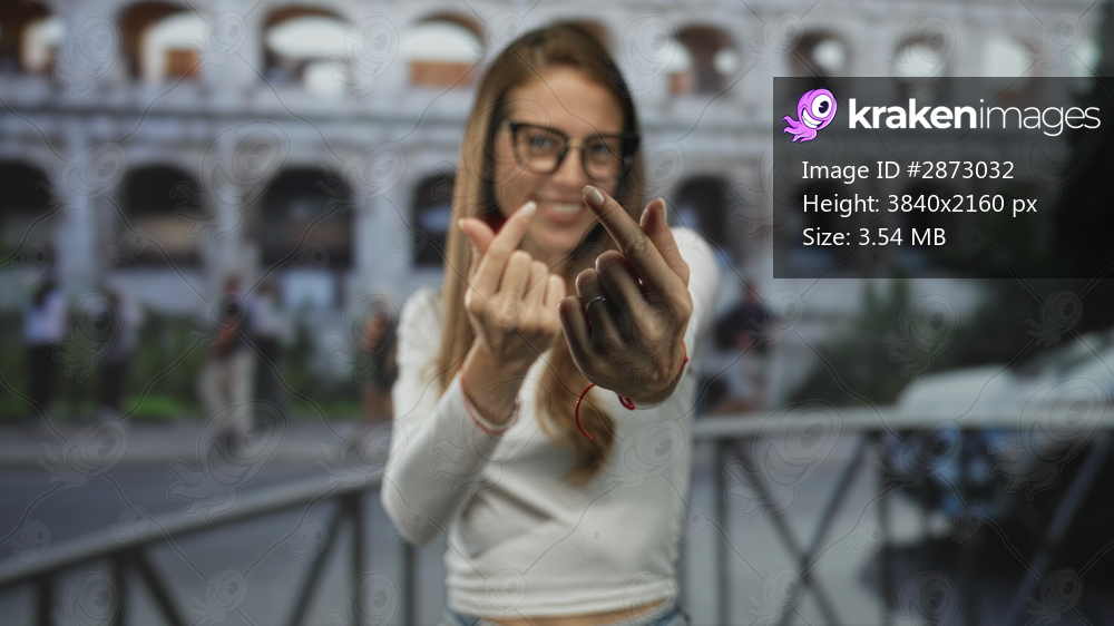 Woman making finger heart gesture with fingers and smiling in front of the roman coliseum building, casual outfit visible; playful travel.