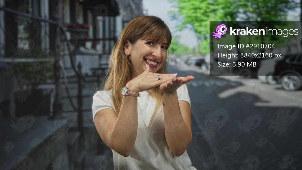 Woman making finger heart gesture with hands on an urban street lined with parked cars and green trees; joy.
