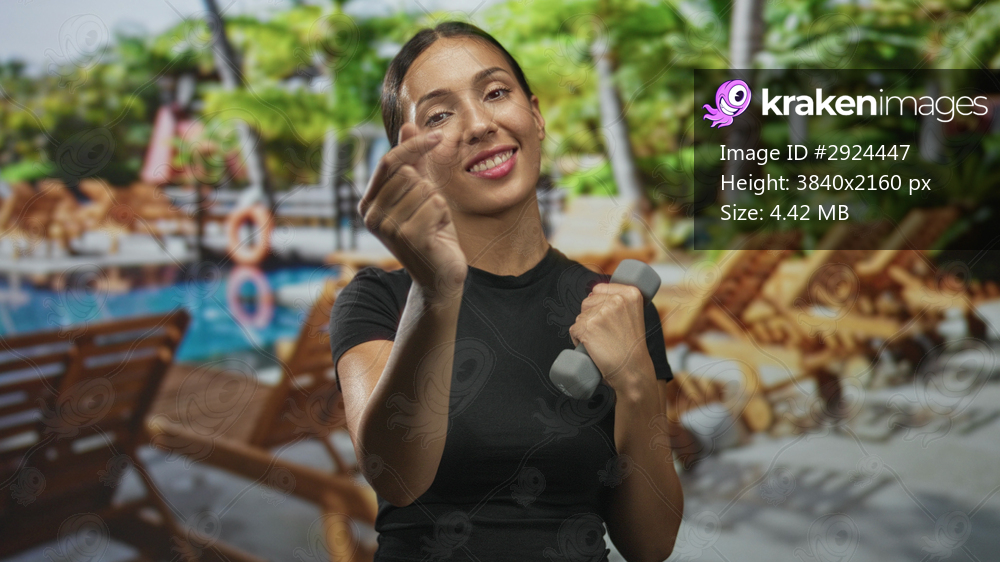 Woman making finger heart gesture while holding dumbbell in studio; playful wellness and motivation.
