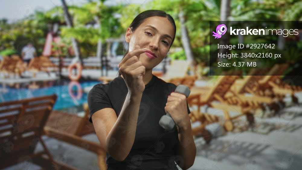 Woman making finger heart gesture while holding dumbbell in studio; playful wellness and motivation.