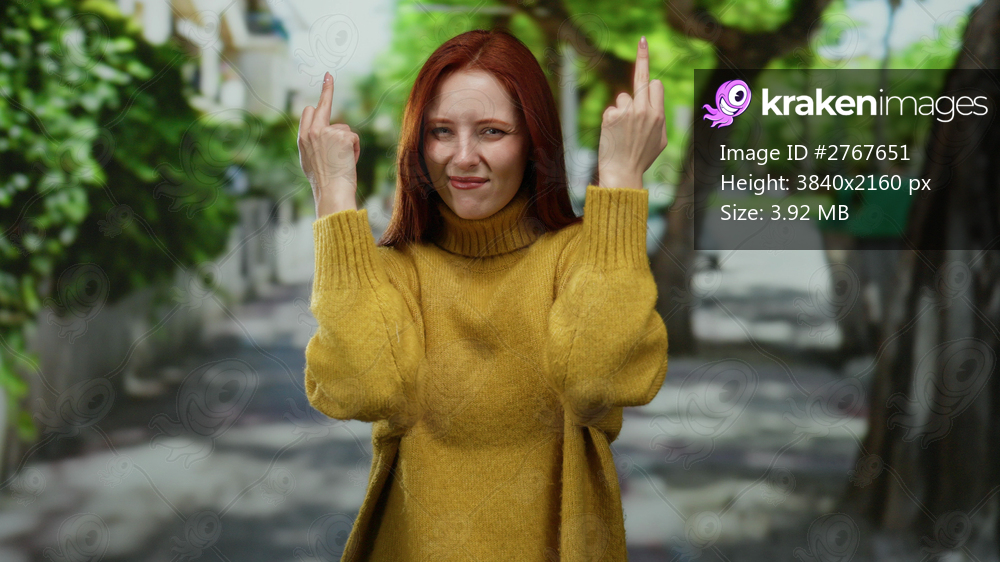 Woman making frustrated gestures on city street wearing yellow sweater, her red hair catching the sunlight as trees and buildings line the urban background. - Kraken Images