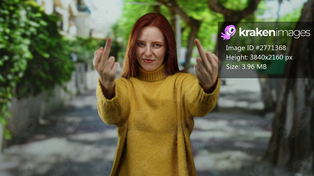 Woman making frustrated gestures on city street wearing yellow sweater, her red hair catching the sunlight as trees and buildings line the urban background. - Kraken Images