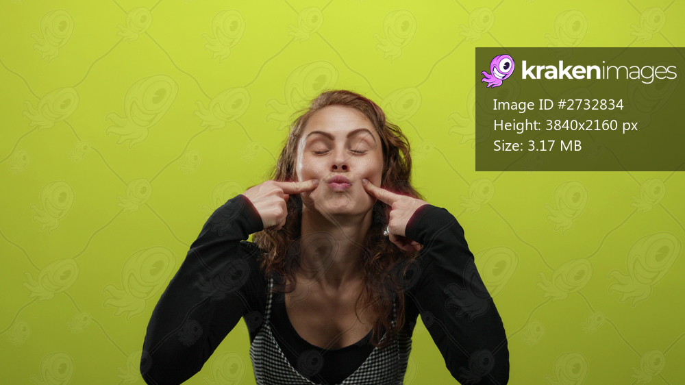 Woman making funny face with fingers on cheeks against a bright yellow background, expressing humor and playfulness, embodying youthful energy and joy. - Kraken Images