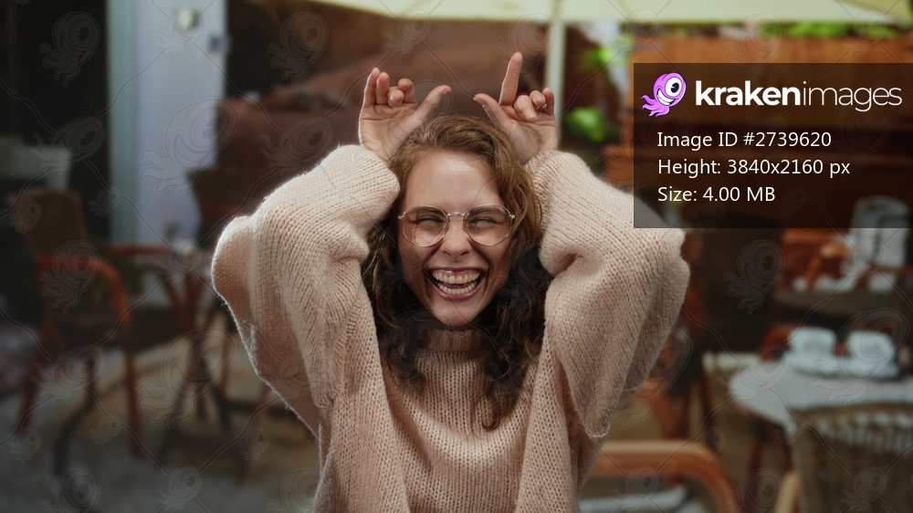 Woman making funny faces in an outdoor city cafe terrace wearing a cozy sweater and glasses showing playful silly gestures with chairs and tables in the background suggesting a relaxed vibe. - Kraken Images