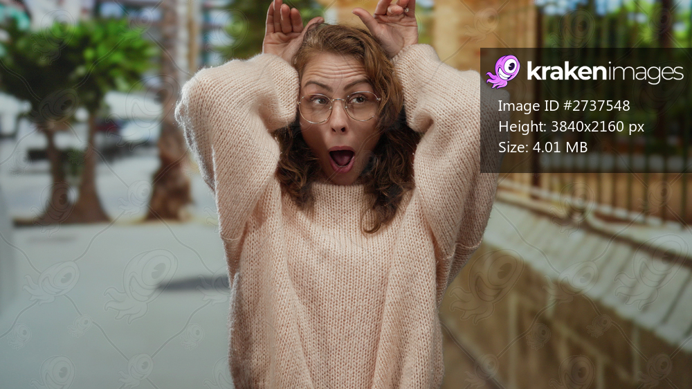 Woman making funny faces in an urban street setting, showcasing playful expression with glasses and curly hair outdoors in a city environment with autumn fashion style. - Kraken Images