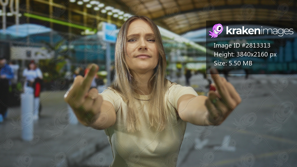 Woman making gesture in outdoor airport, young and blonde in casual attire with terminal in background, conveying defiance and attitude in a busy travel setting. - Kraken Images