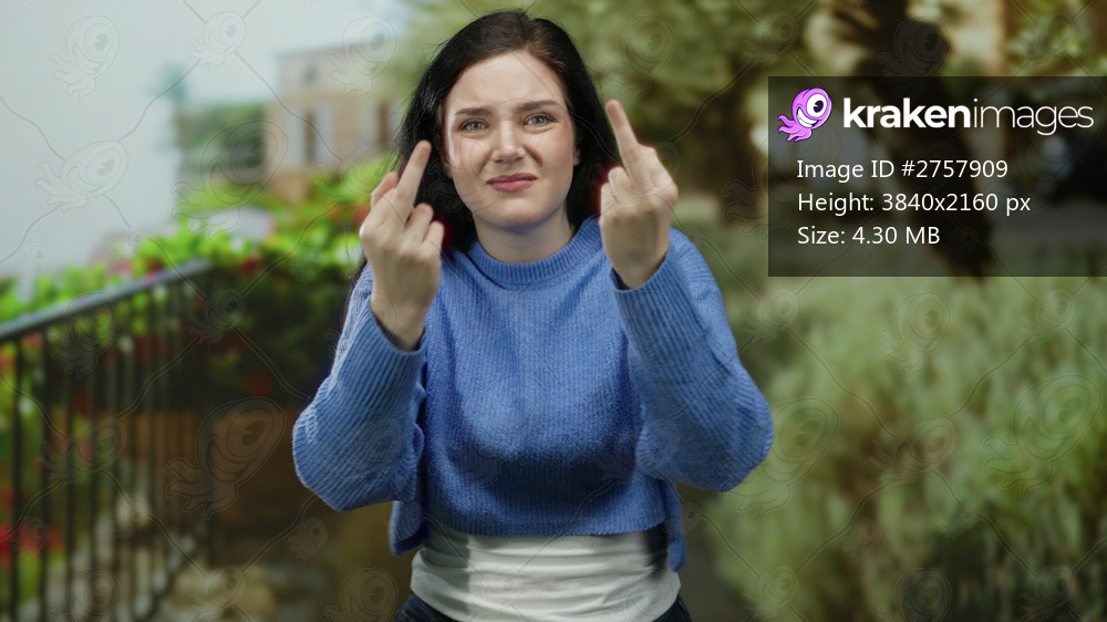 Woman making gesture with middle fingers up while standing in a green park showing frustration and attitude in an outdoor setting captured on a bright day. - Kraken Images