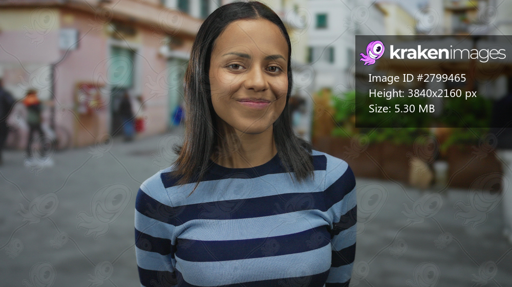 Woman making gesture to be quiet wearing striped shirt on outdoor urban street with blurred background showcasing lively city atmosphere on a sunny day. - Kraken Images