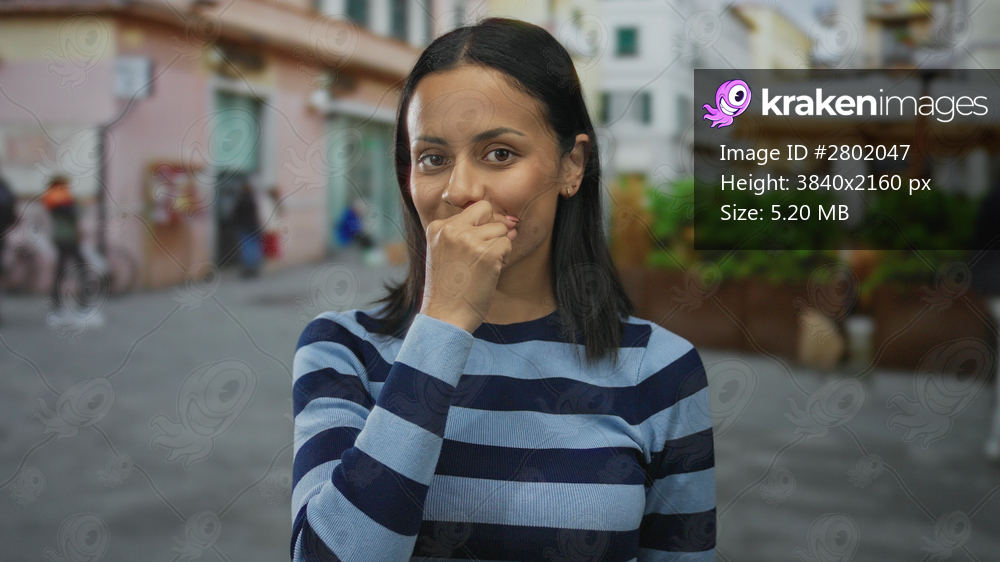 Woman making gesture to be quiet wearing striped shirt on outdoor urban street with blurred background showcasing lively city atmosphere on a sunny day. - Kraken Images