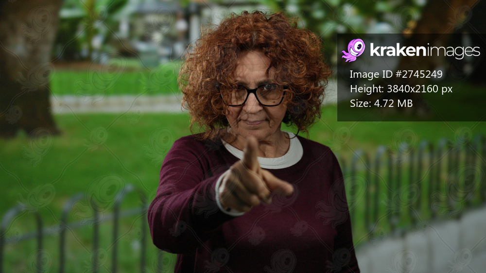 Woman making gestures with intense expression at park, highlighting curly hair, glasses, and outdoor setting, capturing attention with assertive hand signal. - Kraken Images