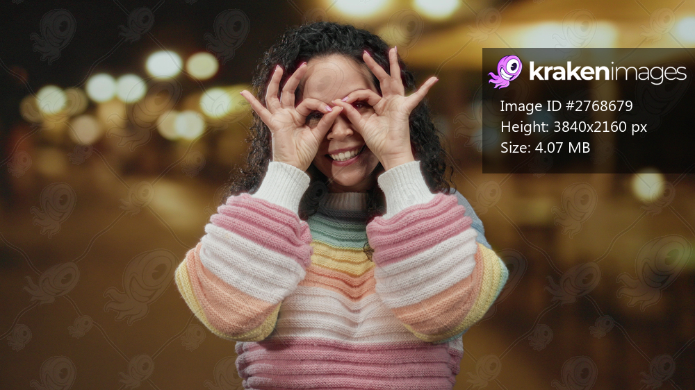 Woman making glasses gesture with hands, smiling joyfully in colorful sweater on an illuminated street at night, conveying playful outdoor vibes.
