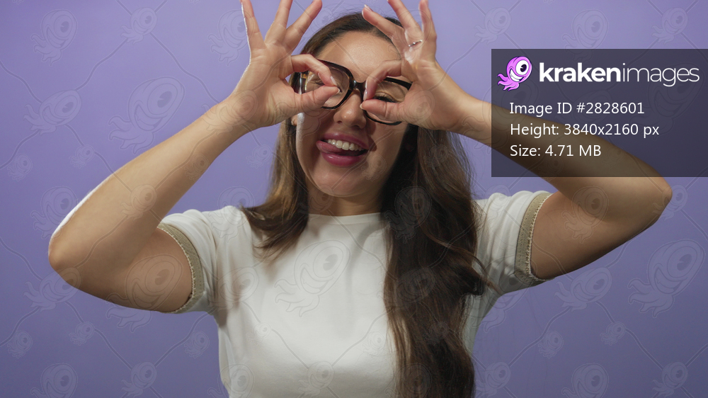 Woman making hand binoculars gesture around eyes and laughing while smiling in purple studio; playfulness curiosity discovery imagination.