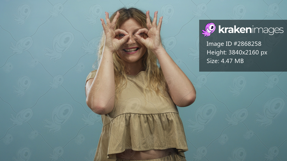 Woman making hand binoculars gesture in blue studio, smiling with visible hands and midriff; playful curiosity.