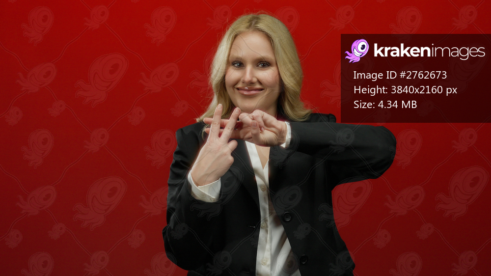 Woman making hashtag gesture in black blazer against striking red background, conveying social media interaction with confident expression and blonde hair - Kraken Images
