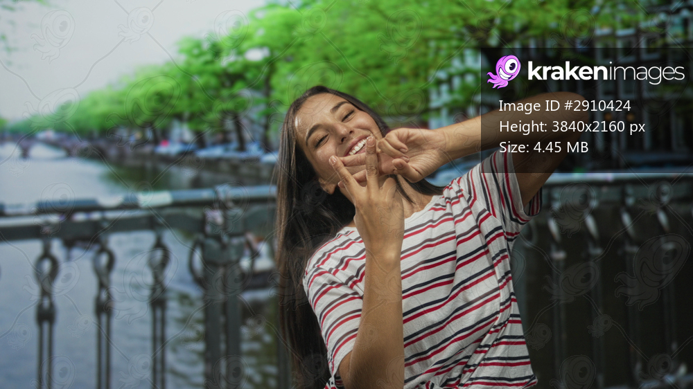 Woman making hashtag hand sign with fingers on a canal street bridge in amsterdam; social sharing joy.