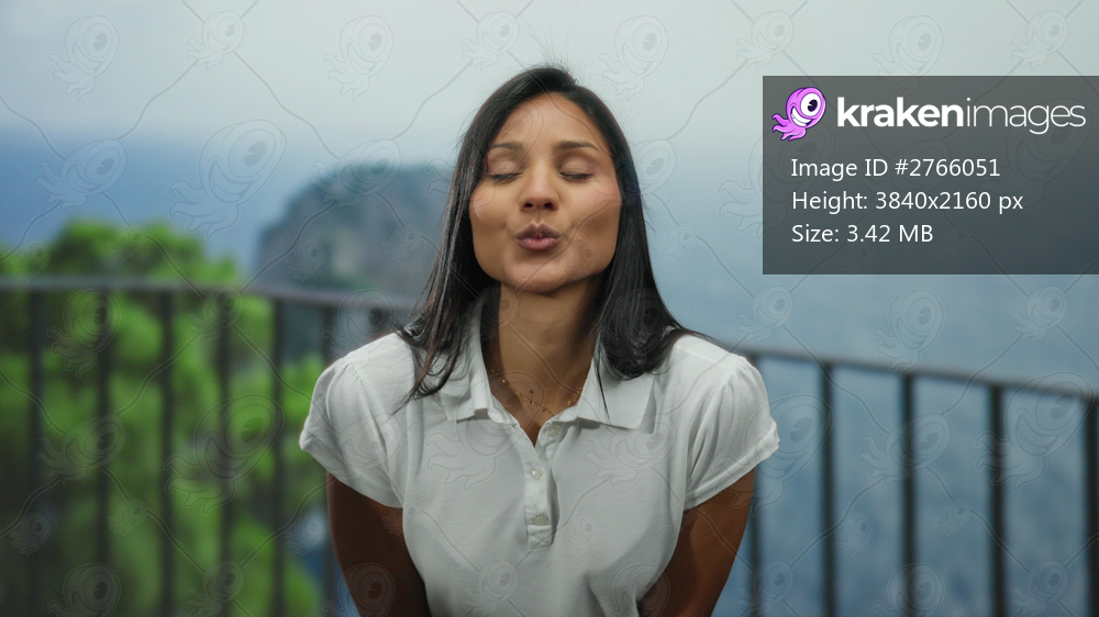 Woman making heart gesture and blowing kiss at camera against seaside backdrop, wearing casual attire, showcasing youthful hispanic aura on a serene promenade. - Kraken Images