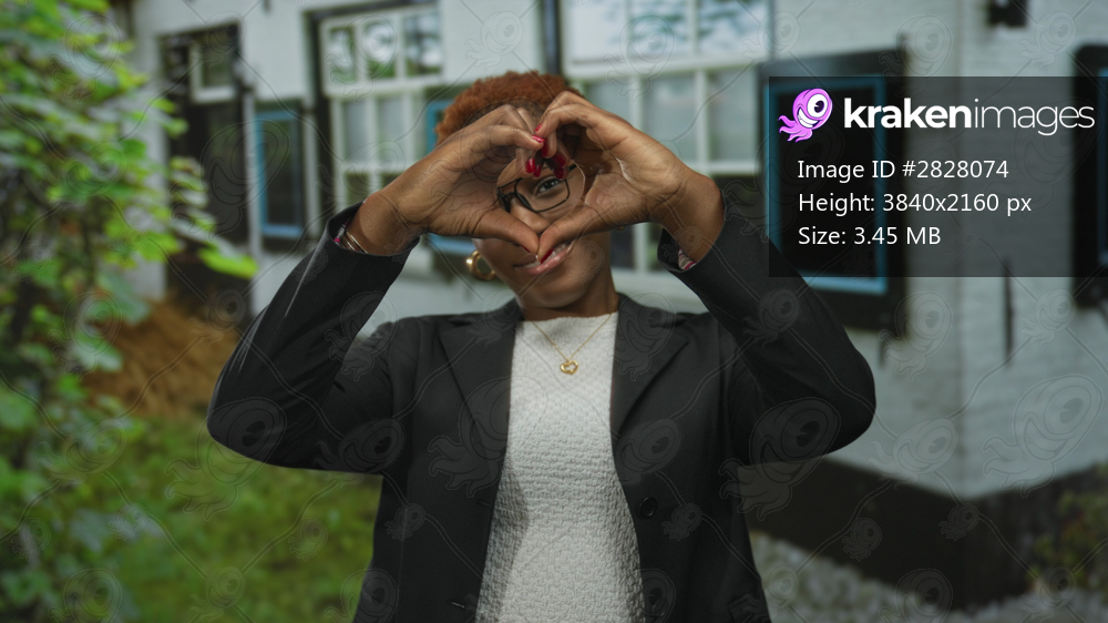 Woman making heart gesture with hands at building entrance outdoors by white brick house windows and green foliage on a sunny day; love happiness.
