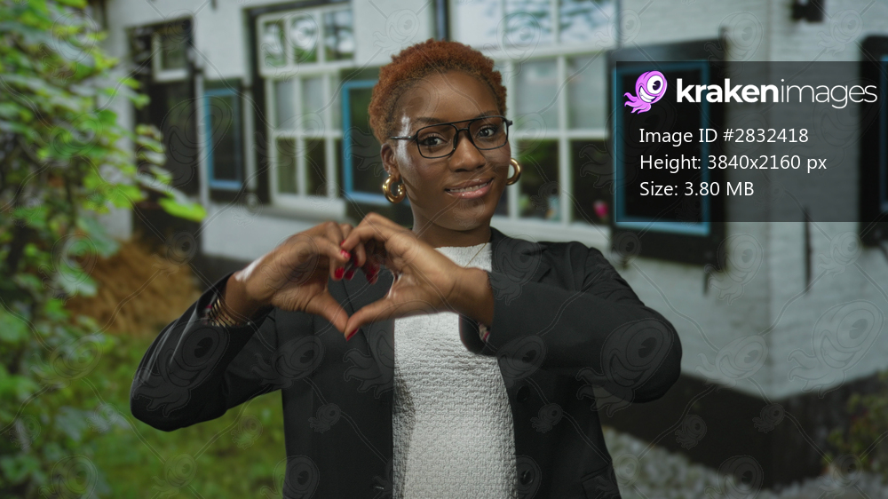 Woman making heart gesture with hands at building entrance outdoors by white brick house windows and green foliage on a sunny day; love happiness.