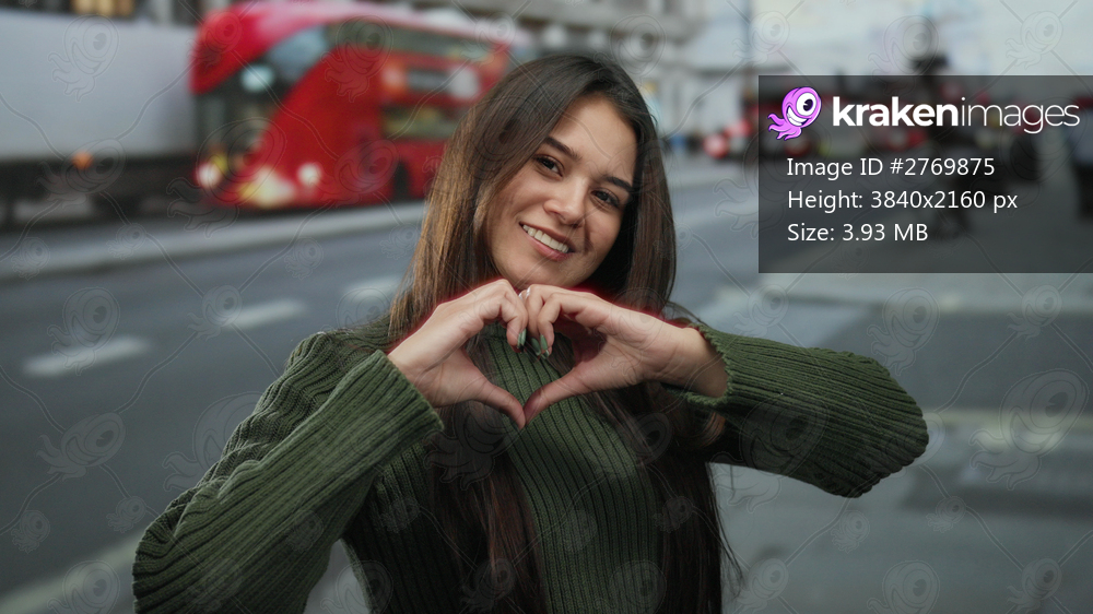 Woman making heart gesture with hands on busy street with red buses in background showcasing urban outdoor setting.