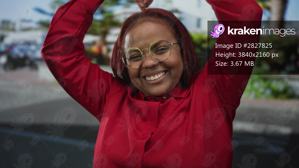Woman making heart gesture with raised arms and wide smile while wearing red shirt on a bustling city street; joy.